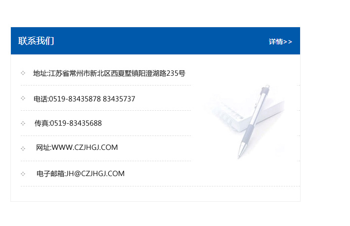 傳真:0519-83435688    郵編:213135    網址:WWW.czjhgj_com.xcxtw.com    電子郵箱:JH@czjhgj_com.xcxtw.com